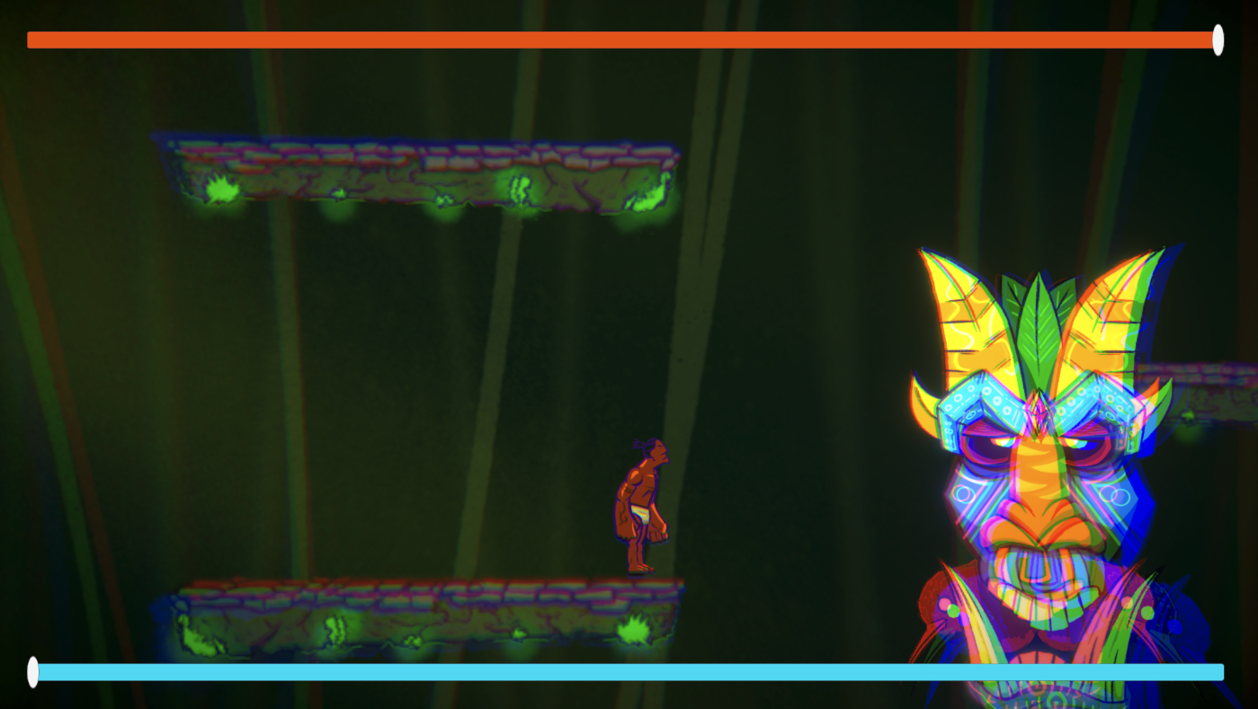 The game goes about a tribe member that is preparing for battle, so he eats a mushroom and have an imaginary fight with a satue of a mask, the experience ends when he defeats the mask.